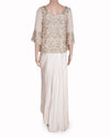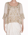 A&R By Rhea Kapoor with this exquisite two-piece ensemble. The set features a cropped, flared-sleeve top meticulously adorned with intricate gold sequin and bead embroidery that catches the light beautifully. The high-neck and mid-length sleeves offer a sophisticated silhouette that balances the opulent detailing. The ensemble is completed by a floor-length draped skirt in a soft, peach-toned fabric. The skirt’s fluid, asymmetrical draping creates a sense of effortless movement and a modern, Grecian-inspired aesthetic.
