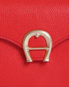 The Aigner Lorena Handbag is a perfect blend of timeless style and modern design. Crafted from high-quality grained leather in a vibrant red hue, it features a structured, saddle-bag silhouette with a fold-over flap and magnetic snap closure. The standout detail is the polished gold-tone 'A' logo on the front, adding a touch of signature luxury. A long, adjustable leather strap with a chain section allows versatile styling as a crossbody or shoulder bag.
