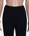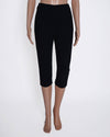 Alexander McQueen Black Zip Capri Pants are a chic and edgy piece of modern tailoring. The pants are a classic black and feature a stylish capri silhouette. The design is a perfect blend of high-fashion and edgy style, with a sleek, structured fit and a gold-toned zipper at the bottom of each leg, a signature detail of the brand.