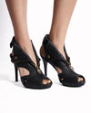 Alexander McQueen Faithfull Heeled Sandals are expertly crafted from premium black matte leather, featuring a complex, multi-layered design inspired by vintage biker jackets. The open-toe silhouette is defined by dramatic folded leather lapels secured with antique gold-tone snap buttons and a functional central zipper with a signature skull pull-tab.