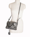 Alexander McQueen Metallic Leather Crossbody Bag is rendered in premium metallic leather. A standout feature is the iconic silver-tone skull padlock charm hanging from the front handle, serving as a definitive mark of Alexander McQueen’s provocative luxury heritage. Finished with dual rolled leather top handles and a slender, adjustable crossbody strap.