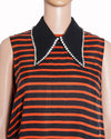 Alexander McQueen Striped Asymmetric Dress., this dress is meticulously crafted from a premium jersey-blend fabric featuring a bold, graphic orange and black horizontal stripe. The design is anchored by an edgy, sculptural collar style neckline in solid black, accented with high-shine metallic studs that echo the house's signature punk-inspired DNA. Featuring a dramatic, asymmetric handkerchief hemline, this piece is engineered to provide fluid movement and a deconstructed silhouette.