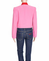 Alexander McQueen Two-Tone Cropped Blazer, this iconic piece is meticulously crafted from premium structured. The design is anchored by its statuesque asymmetric red lapel overlay against a vibrant bubblegum pink base, reflecting the house’s archival obsession with subversive femininity and sharp, military-inspired silhouettes. Featuring a mandarin-style collar and hidden hook-and-eye fastenings.
