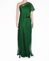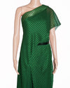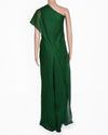 Amit Aggarwal Green Crinkled Chiffon Metallic Jumpsuit embodies the designer's signature style. The one-shoulder silhouette and fluid, crinkled chiffon fabric create a dynamic and elegant drape that moves beautifully. The vibrant green hue is enhanced with subtle metallic undertones, catching the light and adding a futuristic shimmer that is characteristic of Amit Aggarwal's designs. The sculptural cut, including the asymmetrical design and high slit, provides a modern and sophisticated edge, while the impeccable craftsmanship ensures a flattering fit.