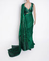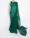 Amit Aggarwal Moulded Top and Draped Saree set in a stunning shade of emerald green is a true masterpiece of modern Indian design. The ensemble features the designer's signature sculptural aesthetic, with a fitted top and a pre-draped saree. The saree and blouse are crafted from a blend of fabrics, including georgette and what appear to be metallic tape and woven polymers, which are staples in the designer's work. The top is a sleeveless, molded piece with pleated and structured details, while the saree has a flowing, pleated drape that transitions into a striking, almost feather-like, architectural pallu.