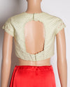 This Priyanka Modi designer blouse exudes grace with its delicate embroidery and intricate lace detailing. The off-white hue, paired with soft floral embellishments, makes it a perfect blend of tradition and sophistication. Ideal for pairing with sarees or lehengas for a timeless, ethereal look.