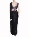 Anjalee & Arjun Kapoor Saree Ensemble in dramatic black. The set features a custom, structured Blouse crafted from a fabric with a glittering metallic gold finish. The blouse is further accented with a delicate hemline fringe of dangling crystal teardrops.