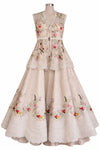 Anushree Reddy Airah Organza Jacket Lehenga Set is rendered in premium sheer organza and raw silk in a sophisticated ivory base. The design is defined by its contemporary layered silhouette, featuring a sophisticated peplum-style sleeveless jacket. A standout feature is the intricate multi-colored thread embroidery, featuring hand-worked floral motifs in vibrant rose, sunshine yellow, and meadow green—a definitive mark of archival Anushree Reddy luxury. Finished with delicate scalloped lace borders, a subtle cinched waist, and a soft silk-blend lining for superior comfort.