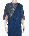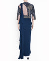 Gaurav Gupta Contemporary Pre-Draped Saree, embodying the designer's signature sculptural aesthetic. The main piece features a flowing, deep Navy Blue silhouette with a fitted bodice. This style is often crafted from lightweight, fluid fabric that molds beautifully to the body. The set appears to include a complementing structured blouse embroidered sequins and beads.
