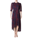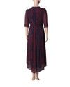 BA&SH dress model Baleares Bordeaux. This Bordeaux BA&SH dress is a midi dress with a navy pattern. The collar and hem are ruffled.