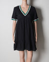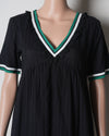 A pre-loved A-line black BA & SH dress with green and white stripes on the V-neckline and sleeves, featuring ruffles on the bottom hemline.