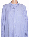 Balenciaga Bowtie Ribbon Long-Sleeve Striped Tunic Shirt is rendered in a classic blue and white vertical pinstripe pattern. The design is defined by its exaggerated tunic-length profile and a dramatic high-low curved hemline, providing a voluminous drape. A standout feature is the integrated pinstriped ribbon at the neckline, which can be elegantly tied into a bowtie for a relaxed, artistic look. Adding a bold pop of color, the shirt features vibrant red balenciaga accents on the shoulders.