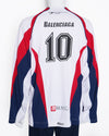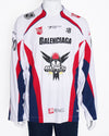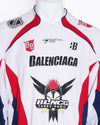 Balenciaga Graphic Jersey, designed for a bold and sporty aesthetic. Crafted from a lightweight performance fabric, this oversized white jersey features striking red and navy panels and signature Balenciaga branding with graphic motifs across the front and sleeves. Perfect for men and women alike, this unisex piece captures the brand’s avant-garde take on athletic-inspired fashion.