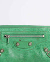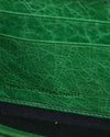 Balenciaga Green Leather Zip-Around City Wallet is a luxurious accessory that combines functionality with the brand's signature edgy aesthetic. Crafted from high-quality green leather, this wallet features the iconic City bag-inspired details, including a zip-around closure and studded hardware. The interior is thoughtfully designed with multiple card slots and compartments, providing ample space for your essentials. Its compact size makes it a versatile choice for both everyday use and special occasions.