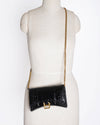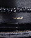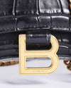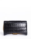 Balenciaga bag is a stylish and structured accessory from the brand's iconic Hourglass line. The bag is a Wallet on Chain crafted from a luxurious, Black crocodile-embossed leather that gives it a sophisticated, textured feel. The standout feature is the bold, polished gold-tone "B" logo hardware on the front, which serves as both a clasp and a signature design element. The bag has a unique, curvilinear silhouette and a versatile gold-tone chain strap that can be worn as a shoulder bag or crossbody.