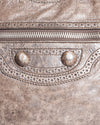 Balenciaga Motocross Giant Folder Brogue Bag is rendered in premium distressed brown leather. The design is defined by its oversized "Giant" silver-tone knurled studs, which provide a bold, industrial contrast to the earthy leather. A standout feature is the intricate brogue-style perforations and pinked edges on the leather trim, adding a touch of traditional craftsmanship to the modern "folder" shape. Finished with sturdy hand-stitched whipstitch handles.