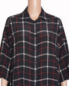 Balenciaga Oversized Multi-Check Shirt is rendered in a dynamic multi-color grid pattern, featuring a black base accented by bold red and crisp white intersecting lines. A standout feature is the fluid, high-low hemline and wide, cropped sleeves that add a contemporary, architectural edge to the classic button-down style. Finished with a traditional pointed collar and contrasting dark buttons along the front placket.