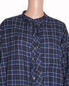 Balenciaga Oversized Shirt is rendered in a dynamic navy blue and white grid check pattern. The design is defined by its exaggerated, oversized silhouette, featuring dropped shoulders and a voluminous body that creates a bold, effortless drape. A standout feature is the extended scarf-style tie at the neck, which can be styled in multiple ways to add a layer of sartorial flair. Finished with full-length sleeves, buttoned cuffs, and a curved hemline.