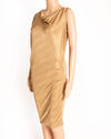 BCBG Asymmetric Dress in a beautiful golden hue. Crafted from a luxurious, flowing fabric, this top features an elegant cowl neck and a modern asymmetric hemline, creating a sophisticated and flattering silhouette. The shimmering golden shade adds a touch of glamour, making it perfect for both evening events and dressed-up casual occasions.