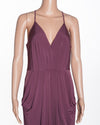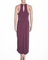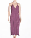 BCBG dress is an elegant and sophisticated piece. The dress is in a beautiful, rich shade of purple, and is crafted from a soft, fluid fabric that drapes beautifully. The design features a flattering cowl neckline and a sleeveless, halter-style top. The standout details are the large draped elements on the front, which create a unique, sculptural effect on the silhouette.