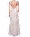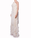 BCBGMAXAZRIA Lace Gown is an ethereal choice for formal events, suitable for both a reception or a stylish black-tie affair. The floor-length gown features an elegant halter neckline and is crafted from intricate white layered over a neutral lining. The silhouette is enhanced by delicate tulle ruffle tiers that cascade down the sides, adding beautiful movement and texture.