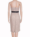 BCBGMAXAZRIA Dress is meticulously crafted from premium floral corded lace, featuring a complex overlay that provides a rich, multi-dimensional texture. The design is defined by its elegant strapless sweetheart neckline and a tailored, figure-skimming bodice that ensures a secure and flattering fit. A standout feature is the contrasting black grosgrain waist ribbon, which cinches the midsection to create a classic hourglass profile.