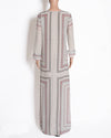 BCBGMAXAZRIA Center Slit Dress is a stunning addition to any wardrobe. The dress features a geometric pattern in a unique color palette of white, pink, and black, creating a bold and artistic statement. The long, elegant silhouette is accentuated by a flattering V-neckline and a dramatic center slit that adds a touch of movement and allure. The lightweight fabric drapes beautifully, making it a comfortable yet elegant choice for a formal event, cocktail party, or evening out.