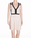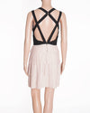 BCBGMAXAZRIA Hartley Mini Dress, designed for sophisticated evening events. The dress features a flattering contrast design with a fitted black bodice and delicate shoulder straps. The skirt and bustline are adorned with multiple tiers of delicate knife-pleated ruffles in a soft, romantic light peach hue. The playful mini length is balanced by the intricate texture and the elegant backless silhouette.