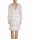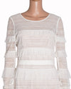 BCBG Max Azria Micro-Pleated Dress in White is crafted from a delicate lace and tulle composition that offers an elegant, feminine aesthetic. The design is defined by all-over micro-pleated ruffles arranged in horizontal layers across the bodice, sleeves, and skirt, creating a rich, multi-dimensional texture. A standout feature is the contrasting nude-toned lining, which enhances the intricate detailing and adds depth while maintaining a sophisticated, modern silhouette.