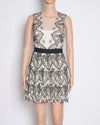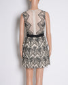 BCBGMAXAZRIA Mini Lace Dress is a timeless cocktail party staple. It features a delicate sheer white overlay with an intricate black lace pattern, creating a bold and elegant contrast. A black waistband cinches the structured silhouette, leading to a playful tiered mini skirt. The sleeveless, high-neck design enhances its chic and modern appeal, making it a perfect choice for evening events or special occasions.