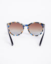 BCBGMAXAZRIA Sunglasses. These statement sunglasses feature a bold, round frame in a unique mottled pattern of blue, orange, and white, exuding a stylish and artistic flair. The thick frames and gradient lenses offer both a glamorous look and excellent sun protection.