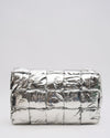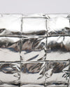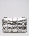 Bottega Veneta Intrecciato Padded Cassette in silver. This iconic bag features Bottega Veneta's signature maxi intrecciato design with a unique padded texture, creating a voluminous and eye-catching silhouette. The metallic silver finish, with its slightly textured look, adds a touch of modern glamour and luxury. With a versatile shoulder strap.