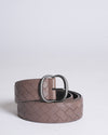This Bottega Veneta Men's Leather Belt is crafted from premium brown leather and features the brand's signature Intrecciato weave. Designed for both elegance and durability, it showcases a sleek, minimalistic buckle that complements its sophisticated aesthetic. A timeless wardrobe essential, this belt effortlessly elevates both casual and formal ensembles.
