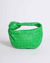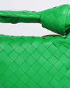 The Bottega Veneta Mini Jodie Bag in a vibrant shade, as pictured in what appears to be a bright green, is a coveted and stylish accessory. Crafted with the brand's iconic Intrecciato woven leather, this mini hobo bag features a distinctive knotted detail on the handle, adding a touch of sculptural elegance.