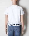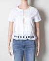 Preloved Boutique Moschino top in cotton with round neck and circular cutout detailings on the sleeves and the hemline.