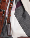 Burberry Tote or Satchel crafted from a mix of materials. The body of the bag is made from fabric with the Mega Check pattern, featuring large diagonal blocks of beige, black, white, and red. This is contrasted with extensive use of rich, dark brown leather trim. The base, handles, zipper trim, and the decorative buckled leather straps running vertically down the front are all dark brown leather.