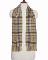 Burberry Scarf is meticulously crafted from premium heavyweight wool, offering exceptional thermal warmth and a soft, substantial hand-feel. The design is defined by its iconic Nova Check-inspired pattern, featuring a sage green base accented with high-contrast cream, dark brown, and charcoal grey horizontal and vertical stripes. A standout feature is the vibrant ochre pinstripe overlay, which provides a sharp, rhythmic pop of autumnal color that traditionalizes the archival design. The scarf is elegantly finished with delicate twisted fringe at both ends.