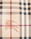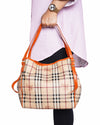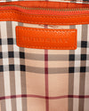 Burberry Haymarket Check Canterbury Tote is rendered in signature Haymarket Check coated canvas, featuring the classic beige, black, and red tartan pattern subtly overlaid with the equestrian knight motif for a definitive archival look, , elegantly elevated by bright orange leather trim and handles. A standout feature is the side leather strap detailing with gold-tone hardware, which allows for slight expansion while maintaining the bag's statuesque profile.