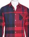 Burberry Oversized Check Color-Block Shirt is crafted in a vibrant red and deep navy blue design, showcasing the brand’s contemporary take on its iconic check aesthetic. The shirt features a bold color-blocked construction that creates a modern, statement look. A standout feature is the coordinated chest pocket set at a diagonal angle, enhancing the shirt’s deconstructed and fashion-forward appeal. Finished with a classic pointed collar and contrasting white button closures that stand out against the rich color palette, this piece offers a striking blend of heritage and modern style.