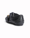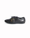 Burberry Women's Low-Top Shoes are rendered in premium black leather, streamlined profile, featuring tonal black stitching and a rounded-toe silhouette. A standout feature is the architectural gold-tone hardware, including a prominent metallic buckle detail on the lateral side that adds a definitive touch of industrial-chic elegance. Finished with traditional black laces and a comfortable low-top collar.