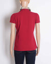 This Burberry women's t-shirt comes in a vibrant red color and features a distinctive collared neckline. The collar Burberry's iconic plaid pattern in beige, black, and red. It has short sleeves and a partial button-down placket at the front. The overall style is a blend of classic polo shirt design with the brand's signature luxury touch.