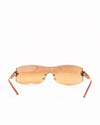 Vintage Bvlgari Sunglasses offer high-impact style with a unique, luxurious flair. The design features a large, continuous rimless shield lens in a warm brown tint. The temples are often the focus of Bvlgari's unique hardware, featuring a bold, embellished detail circular motif near the hinge.