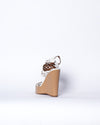 These charming shoes are crafted in a rich cream color with a tan wedge platform heel, featuring unique straps with scalloped edges and triangle cutouts. The ankle strap adds an elevated touch to the design. The shoes also feature a logo on the sole.