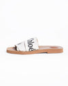 Chloé Woody Logo Strap Slides are a stylish and casual accessory. The slides feature a comfortable, minimalist silhouette with a brown woody. The standout detail is the wide, white canvas strap that crosses over the foot, boldly displaying the "Chloé" logo in black lettering.