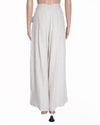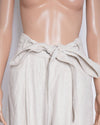 Chola Linen Women's Wide Pants are a chic and contemporary piece, embodying effortless, sustainable style. The trousers are crafted from a lightweight, breathable linen fabric in off-white hue, perfect for warm weather. The design features a modern wide-leg silhouette and unique detailing at the waist, including a fold-over or high-waist band with prominent button closures, and delicate ties or darts that add texture and volume.