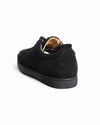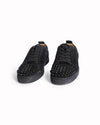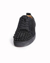 Christian Louboutin Louis Spikes Men's Sneakers are rendered in premium black suede, featuring a tonal black rubber sole and matching black laces for a sleek, uniform look. A standout feature is the hand-placed signature spikes that densely adorn the toe box, adding a sharp, architectural dimension that is instantly recognizable as Louboutin.