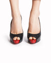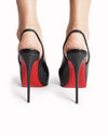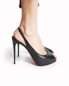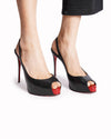 Christian Louboutin Peep-Toe Platform Pumps are rendered in smooth, premium black leather. The design is defined by its striking peep-toe opening, which reveals a pop of vibrant red from the internal platform, creating a cohesive link to the brand’s heritage. A standout feature is the slender slingback strap, which provides an elegant, open-back profile while ensuring a secure fit.