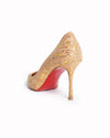 Christian Louboutin Pigalle Follies Cork Pumps. A vibrant reimagining of the iconic "Pigalle" silhouette, these pumps swap traditional leather for a natural cork finish, Infused with multicolor paint-splatter accents and a subtle metallic sheen, they offer a playful yet sophisticated edge to the classic pointed-toe profile. Crafted with a slightly lower, more wearable stiletto heel and the signature red lacquered sole.