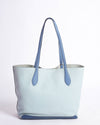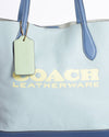 COACH Colourblock Kia Tote Bag, perfect for daily use. The tote is crafted from textured pebbled leather in a soft light Green hue. The design is accented by contrasting Navy Leather on the dual top handles, adding a sharp, modern touch. The front of the bag is branded with a bold embossed "COACH LEATHERWARE" logo in a striking Yellow tone.