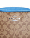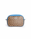 Coach Monogram Jamie Crossbody Bag is rendered in Coach's signature monogram coated canvas in a classic beige. The design is defined by its vibrant blue leather trim, which outlines the bag's rounded "canteen" silhouette and adds a modern pop of color. A standout feature is the sporty, wide webbing guitar strap, which features an integrated "COACH" logo and a blue-and-black striped pattern, offering a comfortable and trend-forward carrying option. Finished with polished silver-tone hardware and the iconic Coach Horse and Carriage metal logo on the front.